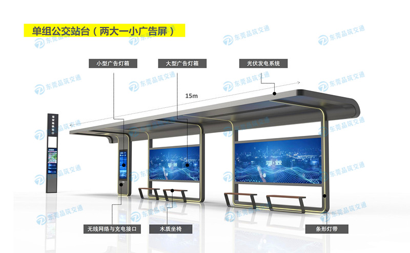 公交站台配置:LED灯带、灯管、换气扇预留位、太阳能无线充电、仿木纹座椅、